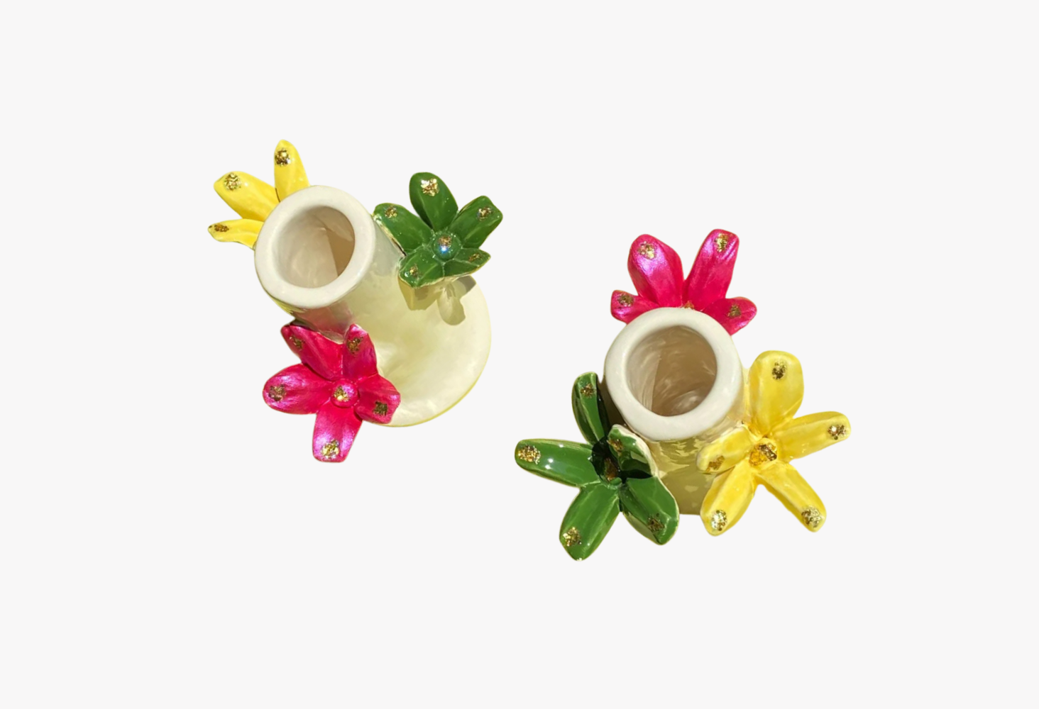 Hand crafted and painted ceramic candleholder with green, yellow, and fuchsia flowers, and gold flake accents. $154