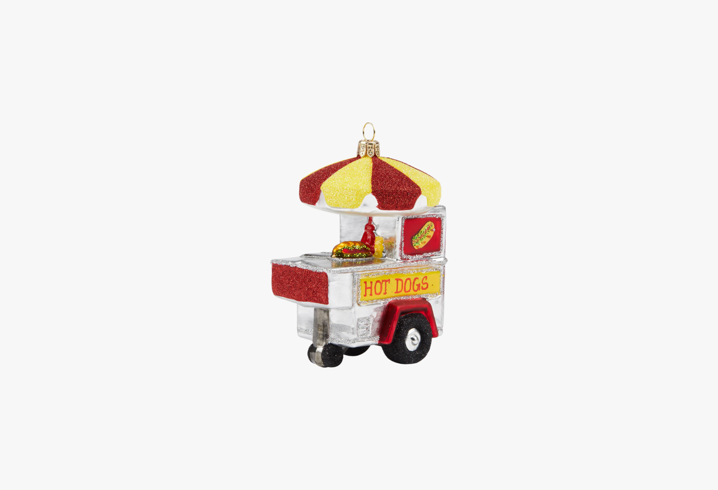 Iconic NYC hand-painted hot dog stand ornament crafted in Poland from mouth-blown glass. $40